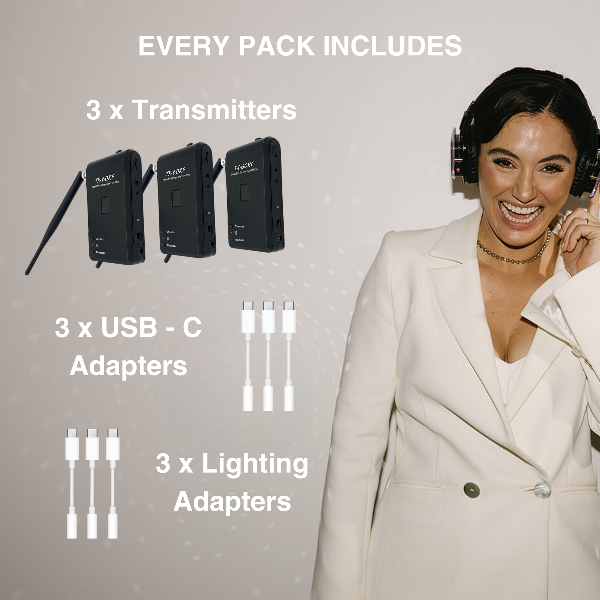We include lighting (apple) and USB-C adapters so any phone will plug into our transmitters